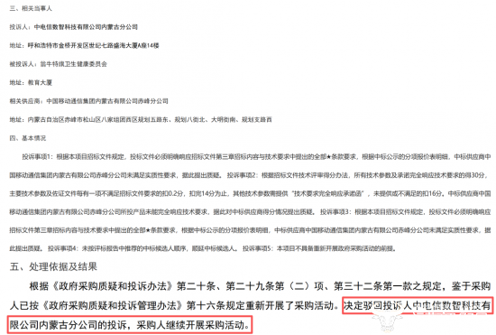 接下来,首轮排名第二的中电信数智科技有限公司内蒙古分公司,向当地财政局提交投诉,要求确认自身中标资格。但监管部门表明鉴于采购活动已重新开展,原中标候选人排序自动失效,决定驳回投诉。所以,内蒙电信数智公司也没顺延中标。