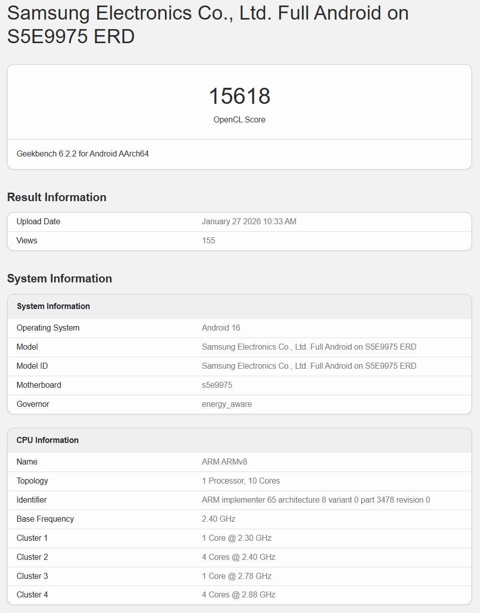 另外,此次曝光的三星Exynos 2700 OpenCL跑分只有15618分,远低于自家的Exynos 2600。这是因为搭载Exynos 2700的设备是工程研发样机,用于调度程序与架构验证工作,跑分并非芯片的真实性能。