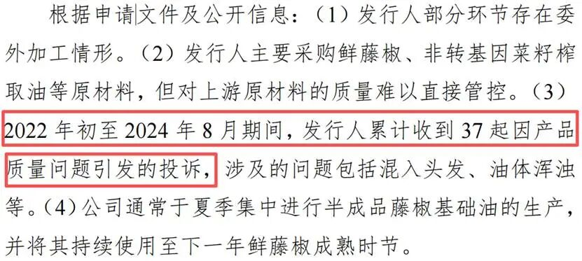 北交所问询函中提到,公司部分环节存在委外加工情形,而原材料以鲜藤椒、菜籽油等农产品为主,上游质量波动客观存在。报告期内,公司累计收到37起产品质量相关投诉,涉及异物混入、油体浑浊等问题。