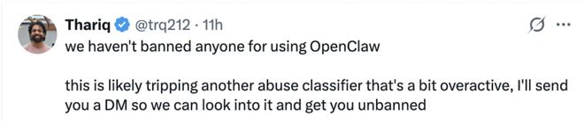 随着帖子热度的高涨,之后,Anthropic 的一位工程师 Thariq Shihipar 也“入场”了。他表示,“我们并没有因为使用 OpenClaw 而封禁任何人。这很可能是触发了另一个有点过于敏感的滥用检测分类器。我会给你发私信,我们一起看看情况,帮你解除封禁。”