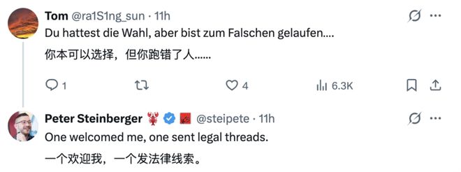 Peter Steinberger 也是毫不犹豫地反击:“他们一个欢迎我,一个发法律函……”