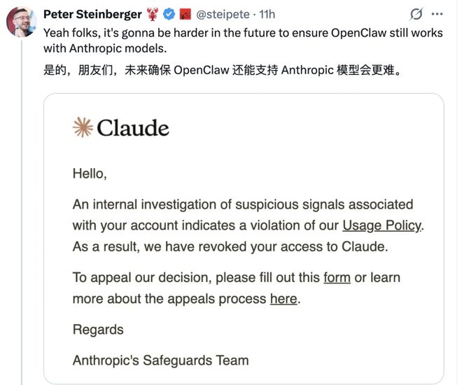 此外,还附上一张来自 Anthropic 安全团队的邮件图片,邮件称,Peter Steinberger 的个人 Claude 账号因“可疑”活动被暂停。