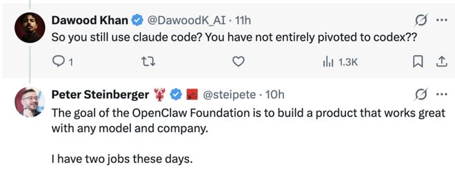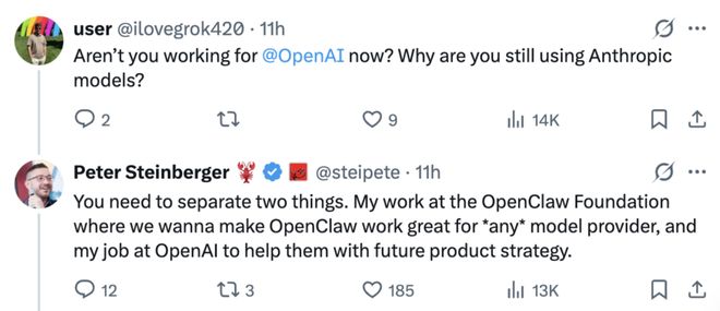 “你需要把两件事区分开来:我在 OpenClaw Foundation 的工作,是希望让 OpenClaw 能够很好地兼容所有的模型 / 提供商;而我在 OpenAI 的工作,则是帮助他们制定未来的产品战略。”