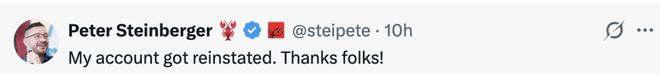 但“封禁”时间没有持续太久,仅仅两个小时后,Peter Steinberger 再次发文:“我的账号被恢复了,谢谢大家!”