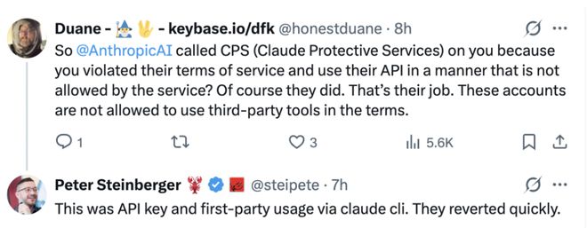 而根据 Peter Steinberger 的说法,也就是说,自从上周 Anthropic 发布新规后,他就一直在严格遵守,使用官方 API 模式,并向账户中预存了资金,从“薅羊毛的开发者”真正转变为“真金白银的付费客户”,但仍然遭到封禁,搞得他现在“连测试都没法做了。”