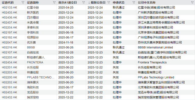 其中,广州新济医药股份有限公司、深圳四方精创资讯股份有限公司、浙江米奥兰特商务会展股份有限公司、Frontera Therapeutics、龙迅半导体(合肥)股份有限公司、瑞派宠物医院管理股份有限公司等6家公司为首次递交。