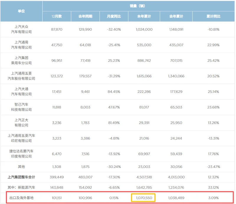 可即便如此,上汽还是顶住压力,对欧出口量历史性地突破了30万辆,稳居中国在欧第一车企。海外总销量呢?也突破了107万辆,创造上汽出口新记录,位列中国第二,仅次于奇瑞。