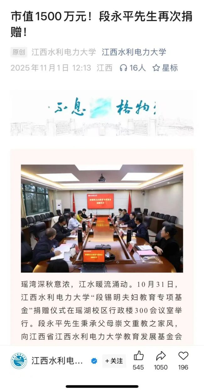 到场出席捐赠仪式的代表,是哥哥段力平。据江西水利电力大学对此的官方报道,“段力平先生在捐赠感言中深情回顾了与江西水利电力大学数十载的情谊。”