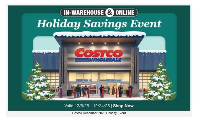 Costco凭会员制、减低库存和生产自家品牌Kirkland Signature优质产品三大策略,得以维持长期低价出售货品,作为公司的发展目标。 图为该公司12月圣觖优惠的宣传讯息。 (Costco官网)