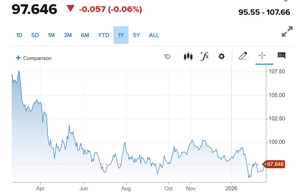 美元指数最近一年的表现(截至2月19日16:12,美元指数为97.646)