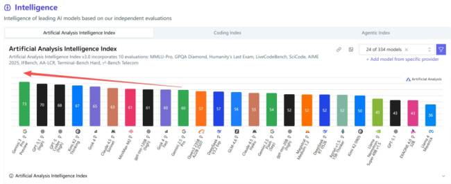根据 Artificial Analysis 平台的独立评测结果显示,其智能指数已超越 OpenAI 的 GPT-5.1 版本。