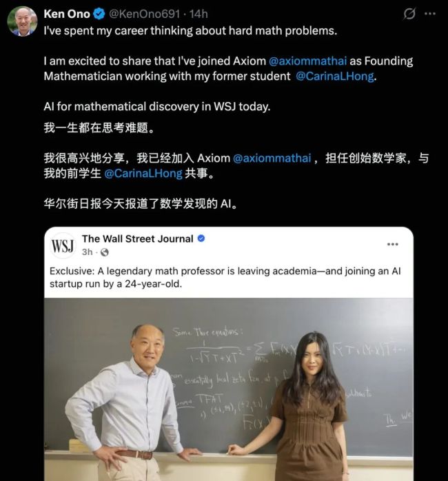 最近,数学界和AI圈被一件事轰动:世界级顶尖数学家小野肯(Ken Ono)宣布辞职,全职加入硅谷AI数学初创公司Axiom。