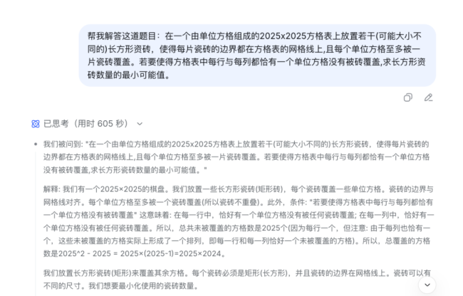 外滩君尝试将一道 IMO 2025 压轴真题,交给 V3.2 解答。它全程思考了约 10 分钟,并在思考中反复验证各种可能性与“意外”,甚至会联系一些经典例题做思考后,再给出自己的答案。