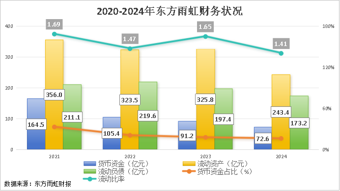 此外,2024年底,公司的流动资产为243.4亿元,比2021年的356.0亿元,蒸发了112.6亿元;而2024年底的流动负债却有173.2亿元,流动比率为1.41,呈现明显的下降趋势。