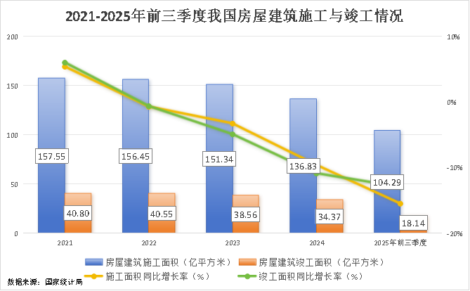 2025年前三季度,我国房屋建筑的施工面积和竣工面积分别为104.29亿平方米和18.14亿平方米,同比下降了15.47%和12.96%。