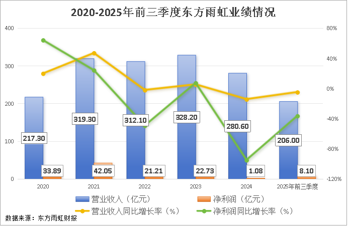 10月28日,东方雨虹发布三季报。2025年前三季度,公司实现营收206.0亿元,同比下降5.06%;净利润为8.10亿元,同比下降36.61%。