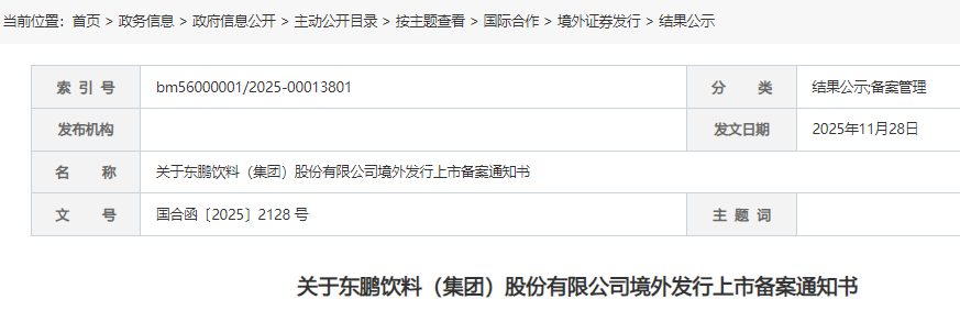 2025年11月28日,中国证监会国际合作司发布关于东鹏饮料(集团)股份有限公司(简称东鹏饮料)(605499.SH)境外发行上市备案通知书(国合函[2025]2128号)。