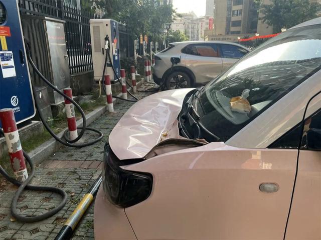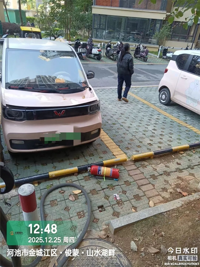 12月25日中午,河池金城江区绿锦华府小区的业主韦女士前往充电桩取车,发现自己的车子引擎盖被砸出一个巨大凹陷,车旁有一只红色的灭火器。