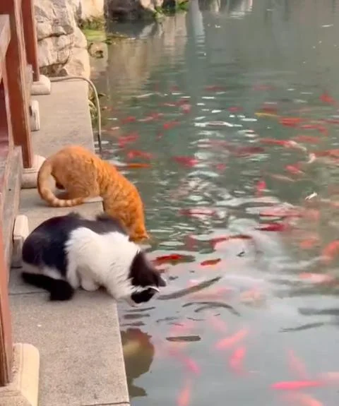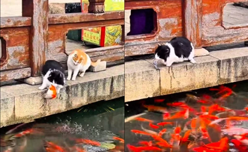相关视频显示,一只奶牛猫和一只橘猫蹲在景观池边,一旦锦鲤群游近便突然伸出前爪,敏捷而精准地从水中抓起锦鲤。两只猫咪在园内自如捕食的场景,吸引不少游客驻足围观和拍摄。它们在网络上也迅速走红,有网友调侃称猫咪把景观池当成了“自助餐区”,也有人笑称“吃多了园区恐怕会有意见”。