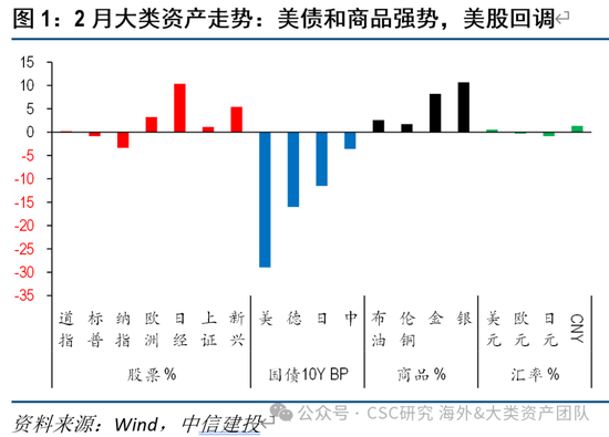 2月以来,全球大类资产适度逆转了年初以来的复苏交易,避险需求升温,美债和贵金属领涨,原油也获得一定支撑,美股、铜等风险资产则走势一般。