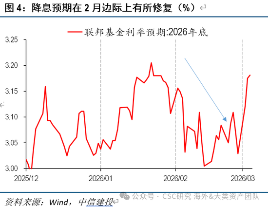 受此影响,降息预期适度修复。年内降息次数从1次再度升至2次,对美债、黄金等资产边际利好。