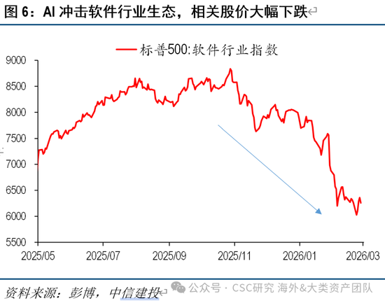 (2)软件行业的生态逻辑被强烈质疑:导火索,2月初,Anthropic推出AI法务等自动化工具,直接冲击传统的软件服务巨头,市场认为AI未来将替代软件核心功能,引发软件股集体崩盘,标普软件行业指数在1月和2月跌幅均在10%左右。