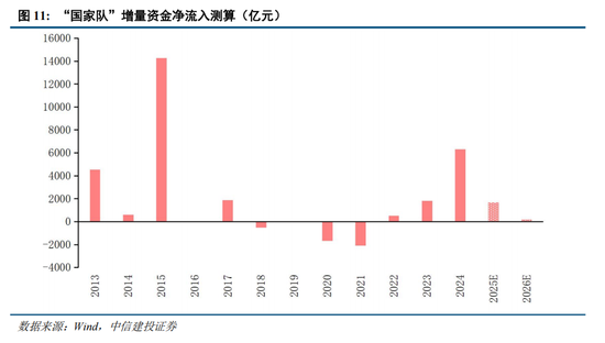 2026年A股牛市环境下,“国家队”资金流入或大幅放缓:自2025年Q2以来,“国家队”持股已经连续两个季度小规模净流出,预计2026年延续每个季度约200亿规模的净流出。而牛市环境下,“国家队”ETF资金流入也将大幅下降,预计2025年下半年资金净流入为0,2026年流入1000亿元,全年“国家队”增量资金净流入约200亿元,相比前两年大幅减少。