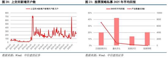 2025年A股市场指数涨幅显著,但行情结构性特征突出,赚钱效应并未充分铺开。2025年有色和通信行业涨幅超过80%,加上电子和电力设备行业,前4大行业对A股的涨幅贡献超过60%。截至2025年底,上证指数几乎位于十年新高,而股价在十年90%以上分位数的个股仅有25%。另一方面,上交所开户数处于历史均值水平,即使在私募基金内部,占绝大多数的主观股票多头策略产品仅取得20%左右的收益水平,而量化多头策略产品数量占比仅10%左右,平均回报则超过40%。