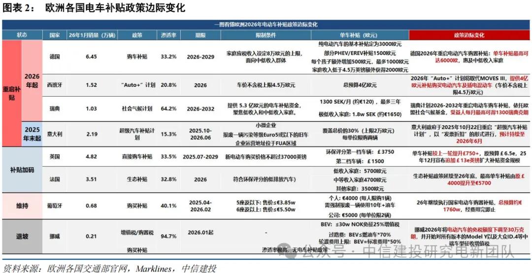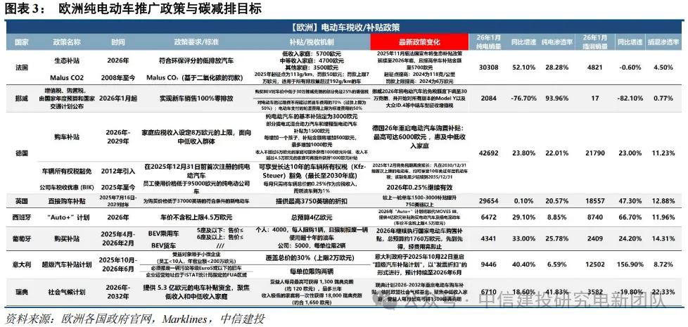 政策端来看:欧盟执委会于2025年3月通过碳排考核的新修正案,原定于2025年的碳排考核目标放宽至三年完成,即以2025-2027年三年碳排放均值作为合规条件。2025年欧洲新能源车销量400.4万辆,同比+34%。2026欧洲多国政策加码提振全年预期,我们预计2026年欧洲电车销量515万辆,同比+29%。