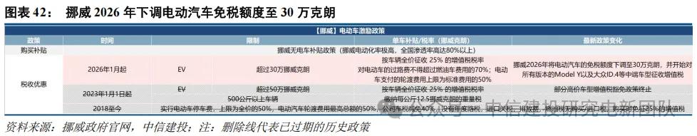 政策方面,挪威政府于2026年1月1日起对电动汽车增值税优惠政策作出重大调整。此前,挪威对售价50万挪威克朗以下的电动汽车实施增值税全额豁免政策;新政实施后,免税门槛大幅下调至30万挪威克朗(约合2.55万欧元),超出部分须按25%标准税率缴纳增值税。增值税门槛的大幅降低显著削弱电动汽车的价格竞争优势,导致2026年1月市场出现严重的需求透支效应,特斯拉销量跌幅高达88%,仅销售83辆。