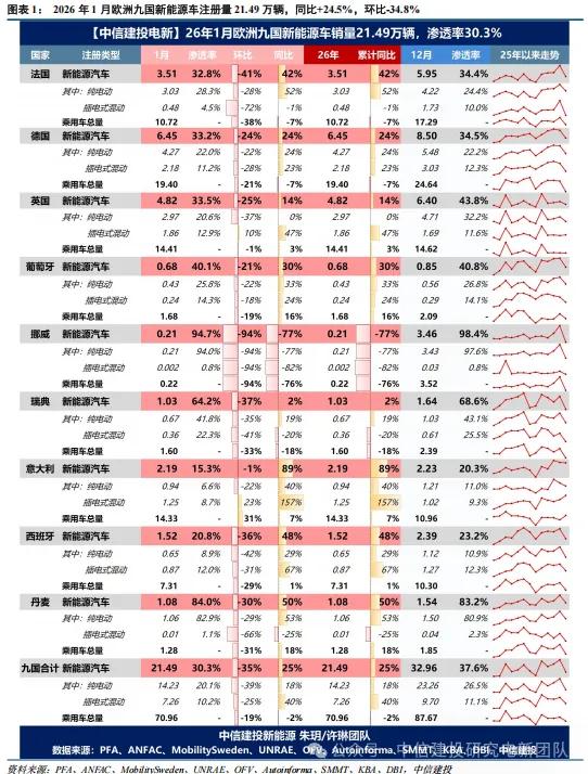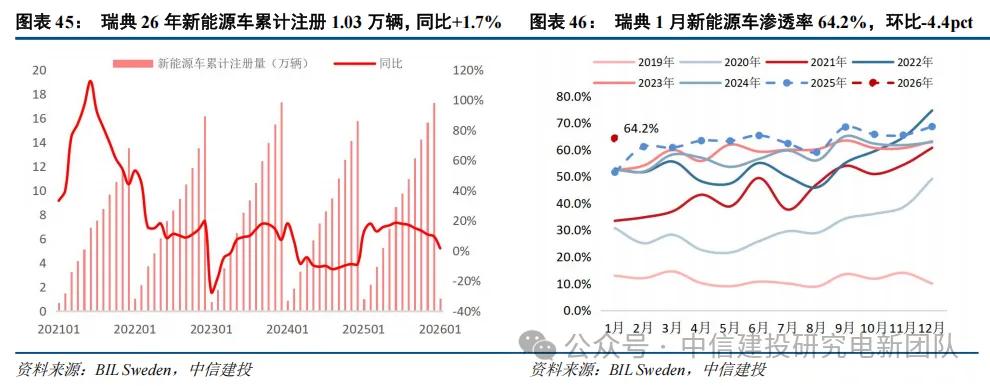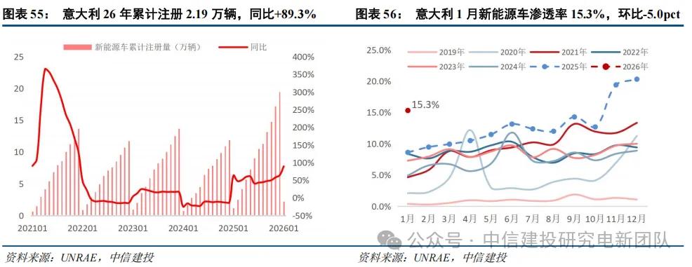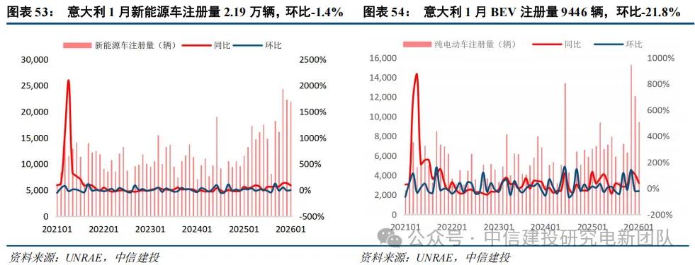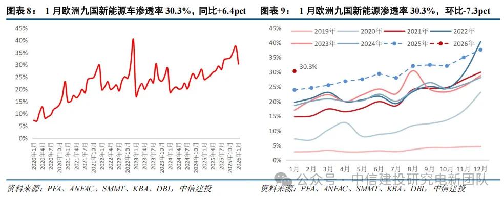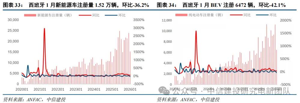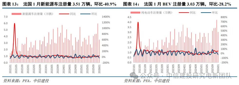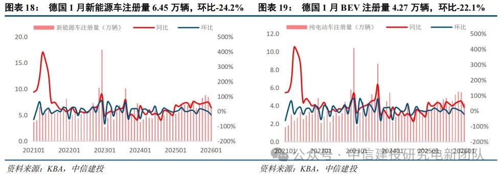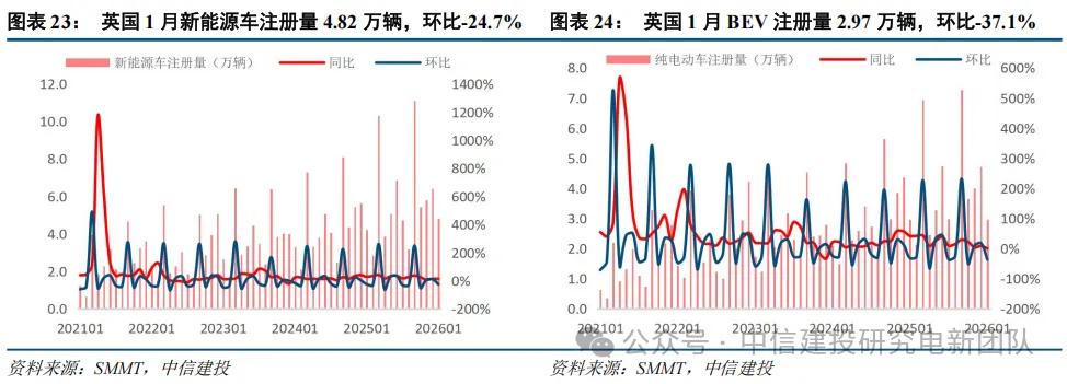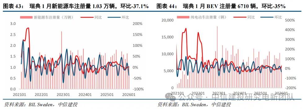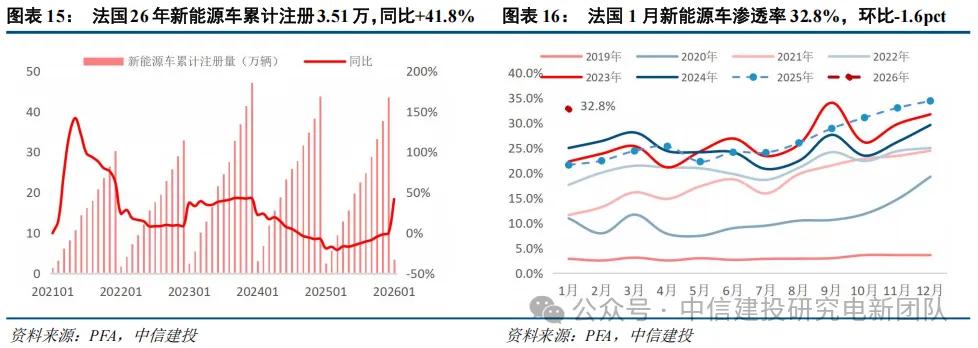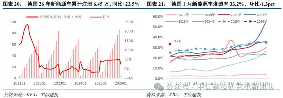 2)德国:1月销量6.45万,同比+24%,环比-24%,渗透率33.2%,环比-1.3pct。同比增长系德国2026年1月1日启动最新电动车补贴政策。