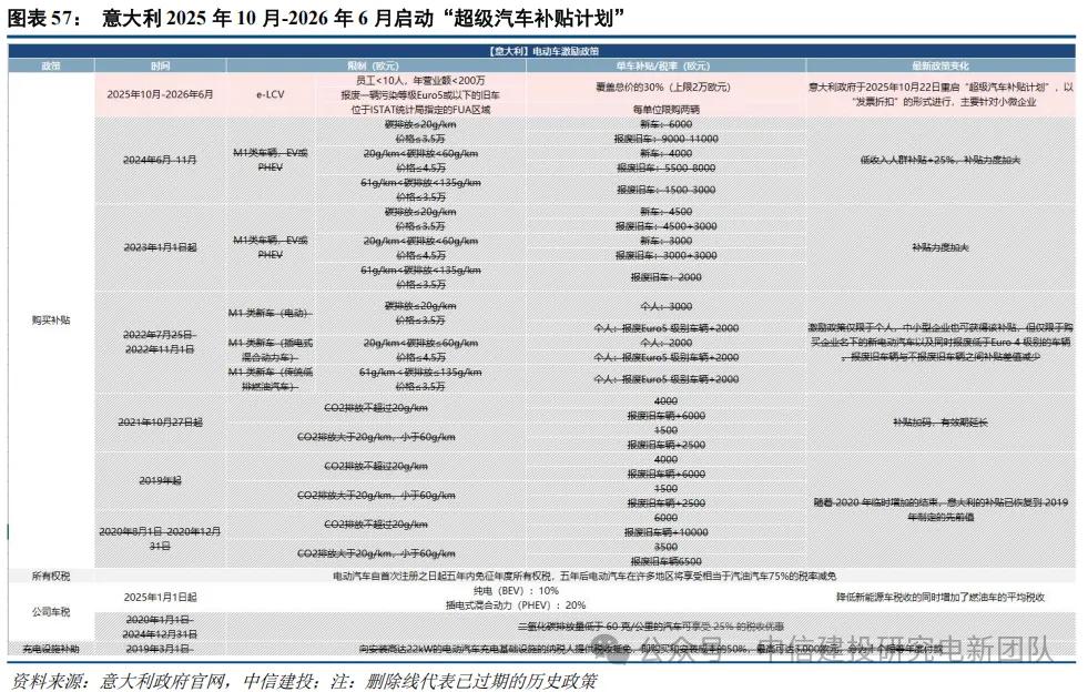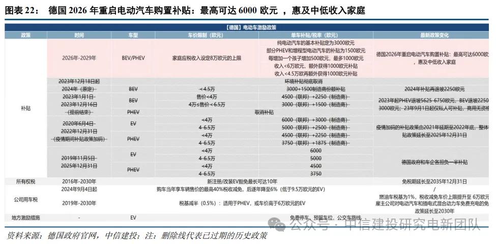 ②德国2026年启动最新电动车补贴政策,总预算30亿欧元,计划持续到2029年,预计可支持约80万辆电动汽车,对私人消费者购买或租赁新车,纯电车补贴3000-6000欧元,插混/增程车补贴1500-4500欧元。