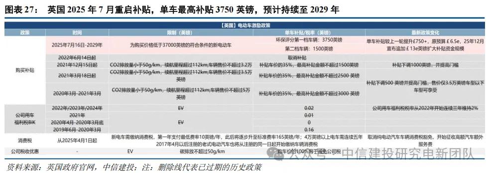 2025年7月15日英国发布6.5亿英镑、单车最高3750英镑的购车补贴,该政策覆盖起售价低于£37,000的全新电动车型,并根据车辆续航及可持续性标准实行两档补助:环保表现最优的“第一档”车型可享£3,750全额补贴,其余达标车型亦可获£1,500优惠。25年12月宣布进一步追加13亿英镑扩大补贴资金规模。此项补贴预计将持续至2029财年,为市场提供稳定的政策激励。