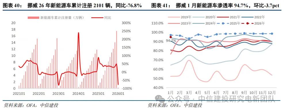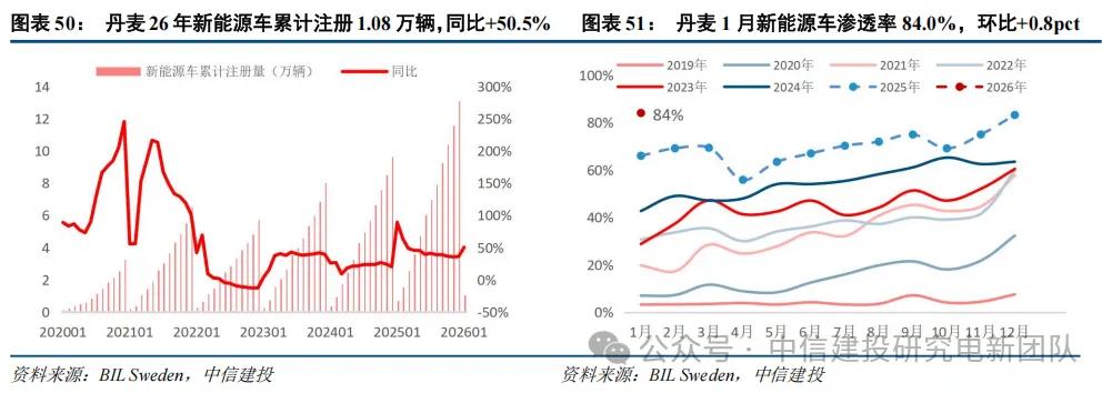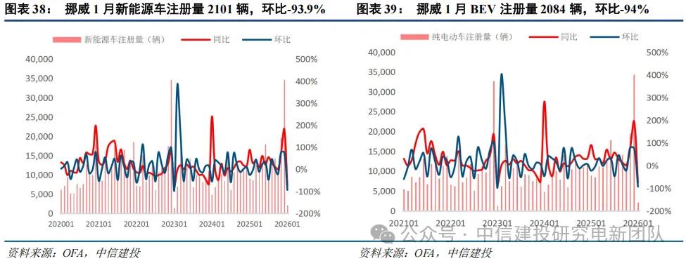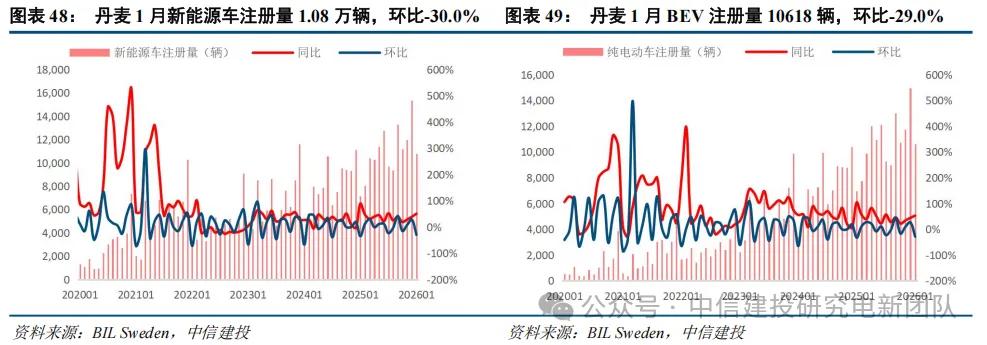 环比来看,1月环比下降主要系25年12月年终冲量效应消退后需求自然回落,叠加挪威取消电动车增值税豁免导致该国销量大幅下降;分国家来看,挪威/英国/丹麦销量分别环比-98.5%/-88.6%/-77.4%。
