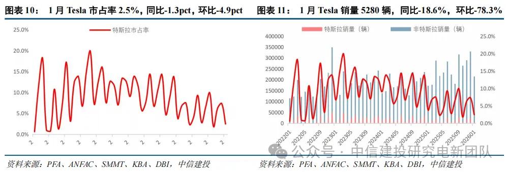 1月九国特斯拉销量合计5280辆,同比-18.6%,环比-78.3%;市占率2.5%,同比-1.3pct,环比-4.9pct。除特斯拉外其他车企九国销量20.96万辆,同比+26.2%,环比-31.3%。同比来看,1月同比下降主要系挪威取消电动车增值税豁免导致当地销量大幅下滑,同时欧洲本土品牌、中国品牌竞争加剧分流需求;分国家来看,挪威/英国/法国销量分别同比-88.0%/-50.8%/-42.0%。环比来看,1月环比下降主要系25年12月年终冲量效应消退后需求自然回落,叠加挪威取消电动车增值税豁免导致该国销量暴跌;分国家来看,挪威/英国/丹麦销量分别环比-98.5%/-88.6%/-77.4%。