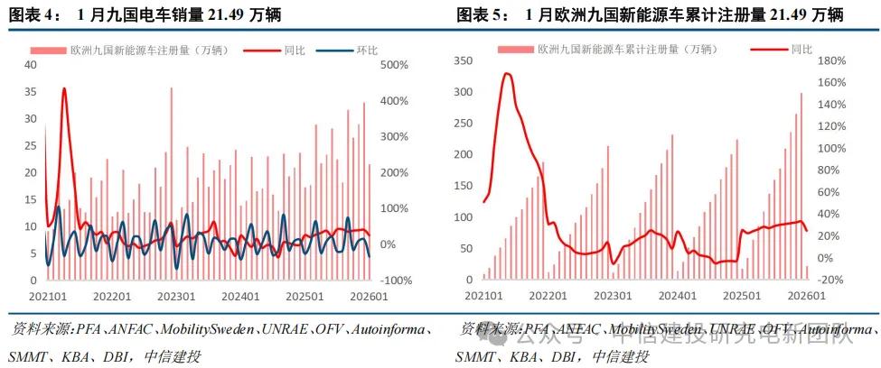 1月九国电车销量21.49万辆,同比+25%,环比-35%,渗透率30.3%,同比+6.4pct,环比-7.3pct。2025年1-12月欧洲新能源车销量400.4万辆,同比+34%。2026年德国、瑞典重启电动车补贴,西班牙将以全新的“Auto+”计划取代“MOVES III计划”。基于此我们预计26年欧洲电车销量515万辆,同比+29%。