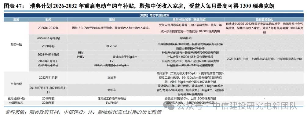 ③瑞典政府计划在2026-2032年期间重启针对电动汽车的购车补贴政策,采用“月度补贴+一次性奖励”的双重支持模式,对所有符合条件的购车家庭发放每月1,300瑞典克朗(约120欧元)的气候奖金,最长可持续发放36个月;针对经济困难群体,一次性发放18,000瑞典克朗(约1,650欧元)低收入家庭启动奖金。