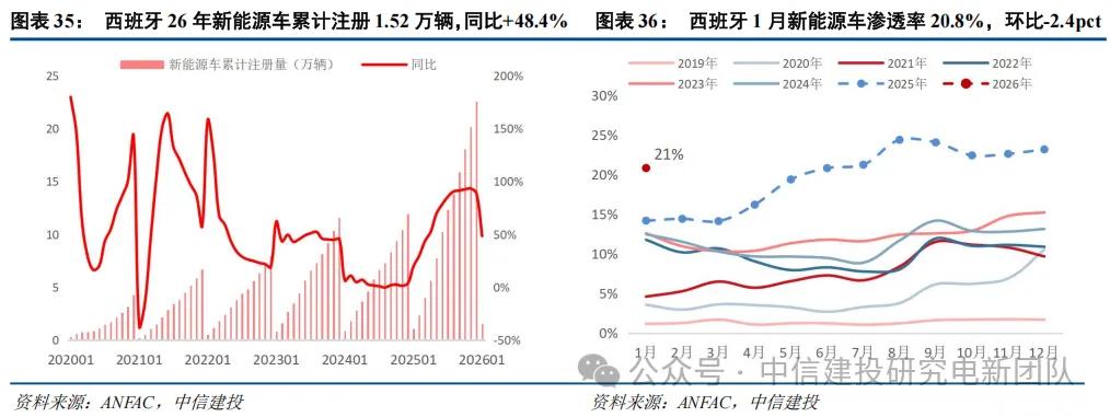 5)西班牙:1月销量1.52万,同比+48%,环比-36%,渗透率20.8%,环比-2.4pct。2026年西班牙政府推出最新的“Auto+计划”取代原有“MOVES III计划”,并延长购买电动汽车15%的个人所得税减免政策至2026年底,带动销量端表现强势。