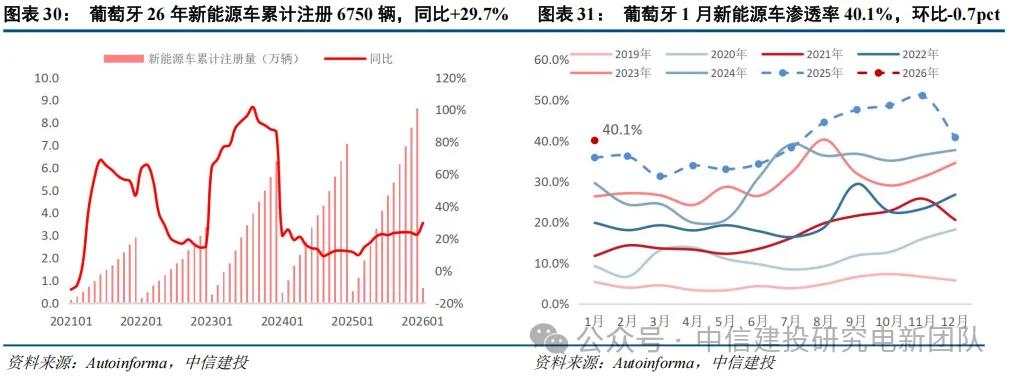 4)葡萄牙:1月销量0.68万,同比+30%,环比-21%,渗透率40.1%,环比-0.7pct。