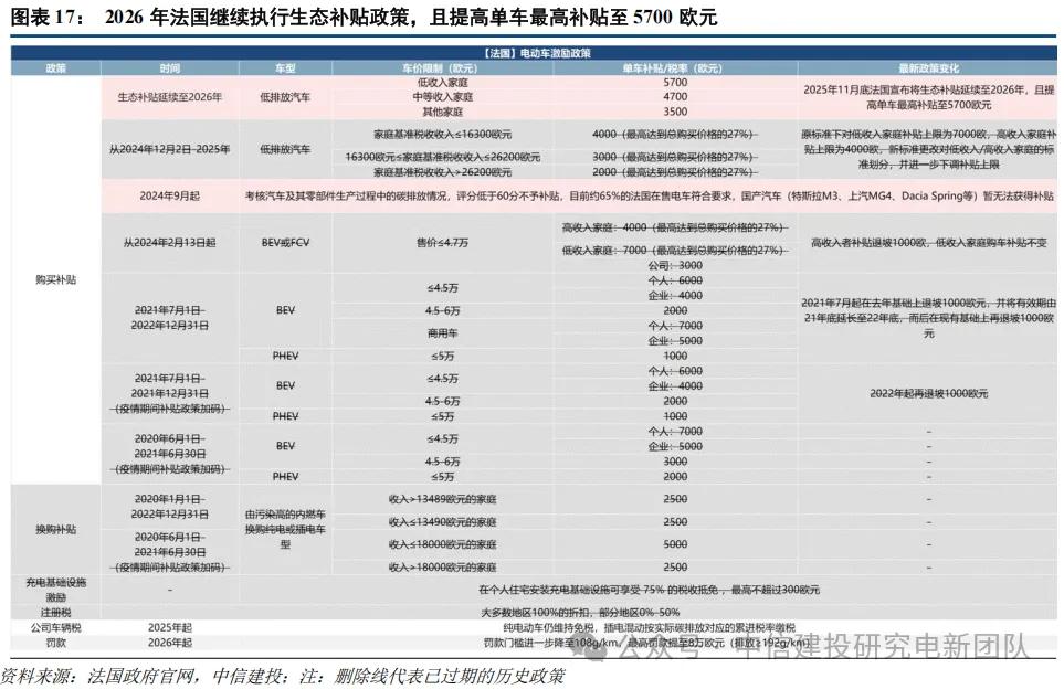 ①法国宣布原定于2025年底到期的生态奖金延续至2026年12月31日,低收入/中等收入/其他家庭最高可获5700欧元(原上限4000欧元)/4700欧元/3500欧元单车购买补贴。