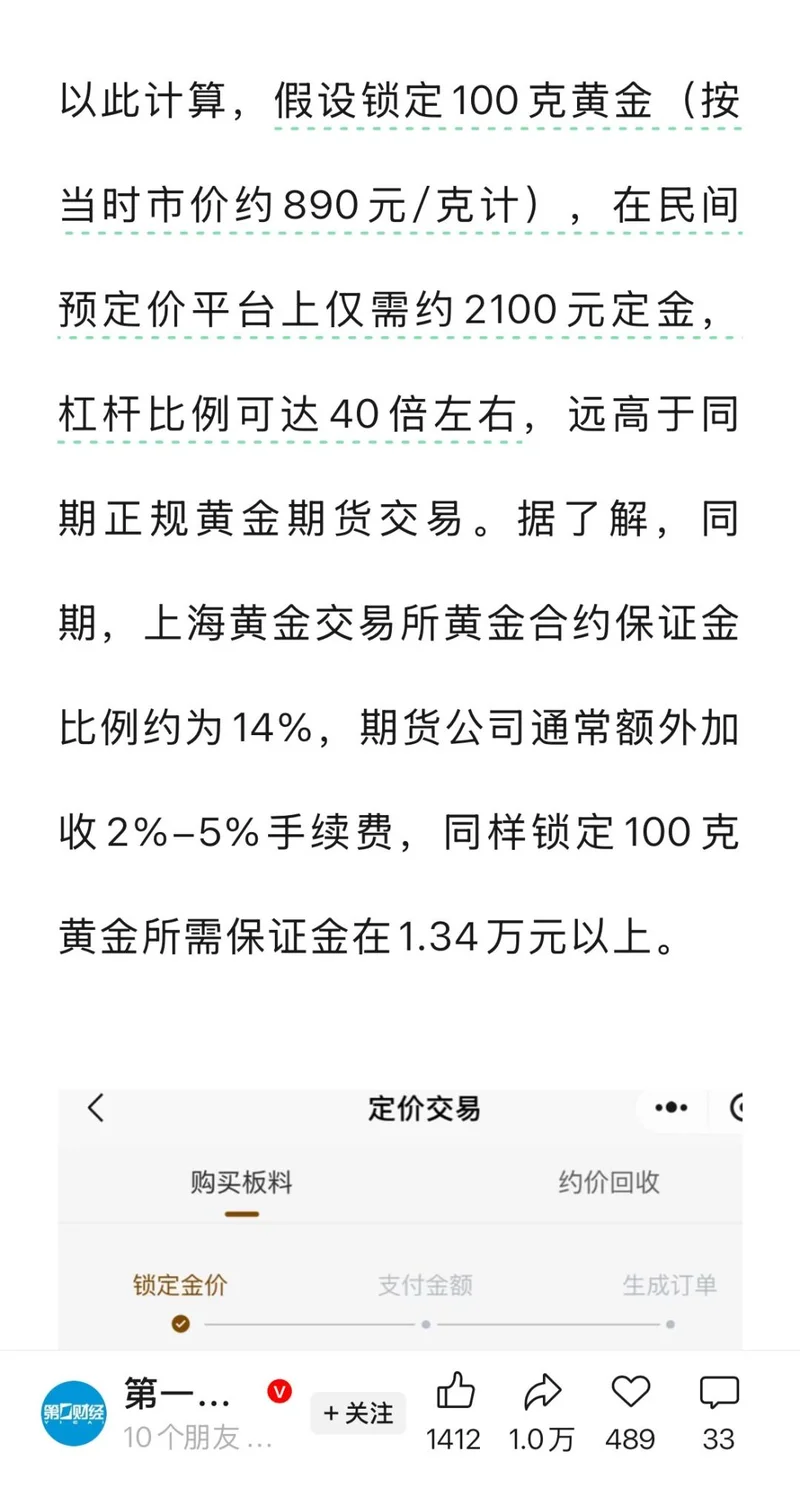 预定价模式是什么?就是用一点钱,赌一克黄金未来的价格涨跌,比如,投资者只需支付2100元定金就能锁定价值100克黄金,杠杆率高达40倍。白银交易的杠杆甚至更高。