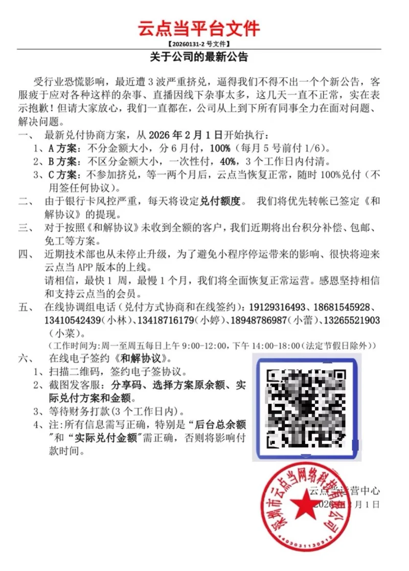 C方案:不参加挤兑,等一两个月后,云点当恢复正常,随时100%兑付(不用签任何协议)。