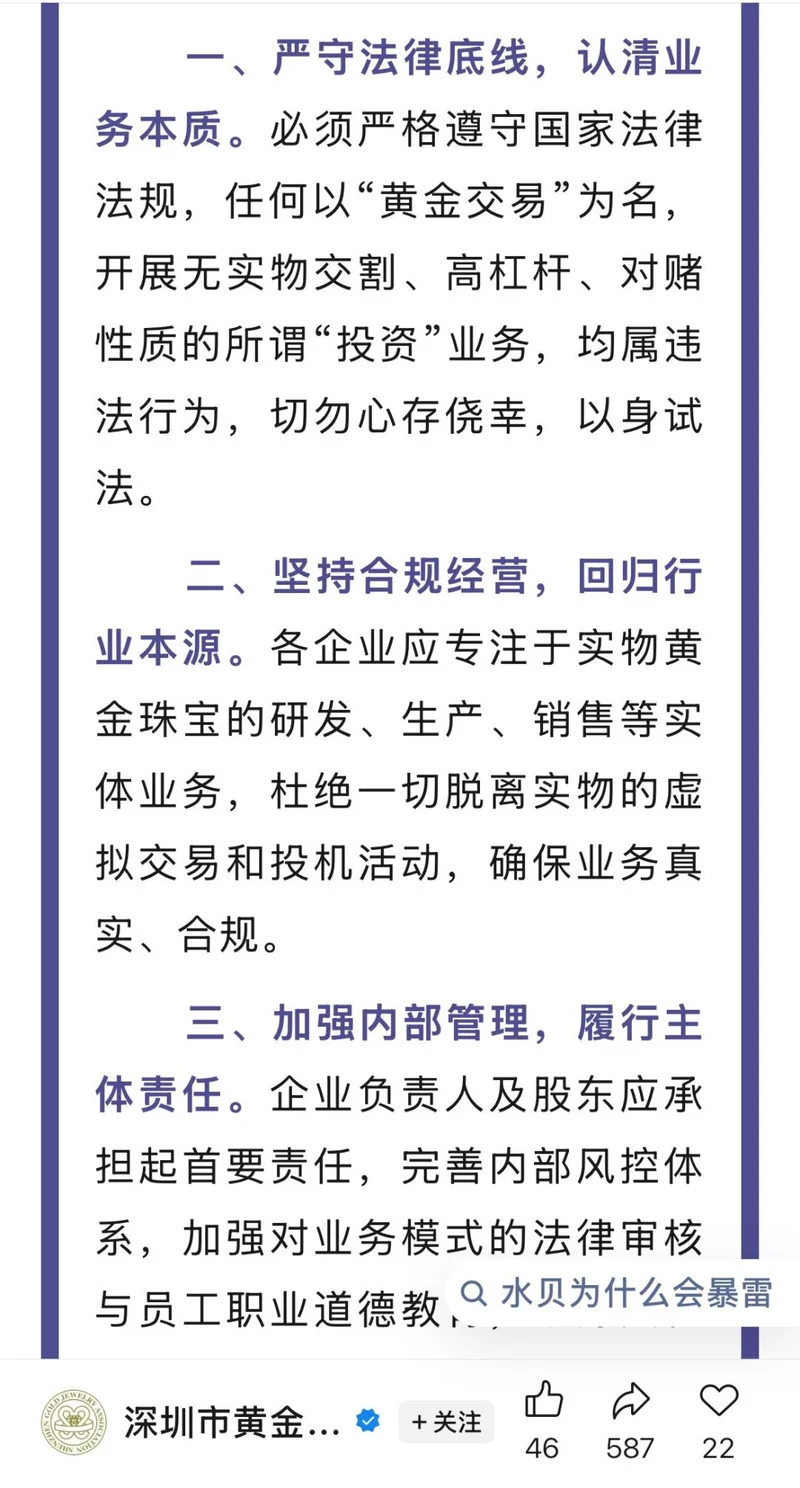 监管部门早在去年10月就给出了提醒。深圳市黄金珠宝首饰行业协会发布行业警示函,指出:任何以“黄金交易”为名,开展无实物交割、高杠杆、对赌性质的所谓“投资”业务,均属违法行为,切勿心存侥幸。