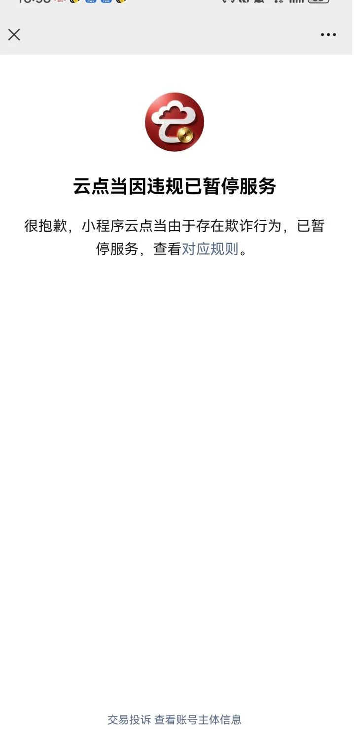 近日,多名用户反馈“云点当”平台无法正常打开,其小程序显示“违规已暂停服务,里面的黄金存料、余额也无法正常提现。
