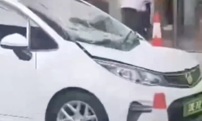 被砸中车的前挡风玻璃稀碎,车头也凹进去了。