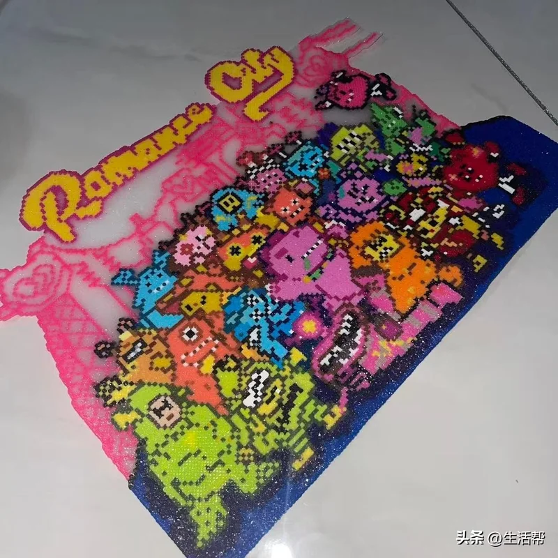 “拼豆最难的不是拼,是熨烫,热胀冷缩容易让豆子变形、凹陷,搬运的时候也容易散。”为了不碰散豆子,她在制作过程中还会特意把容易勾线的毛绒睡衣换下,但即便如此,她也曾不小心碰散过两次,差点想放弃,“因为复原太痛苦了,相近颜色的豆子集中在一起,肉眼很难分辨,要对着灯反复看,光复原就用了近两个小时。”
