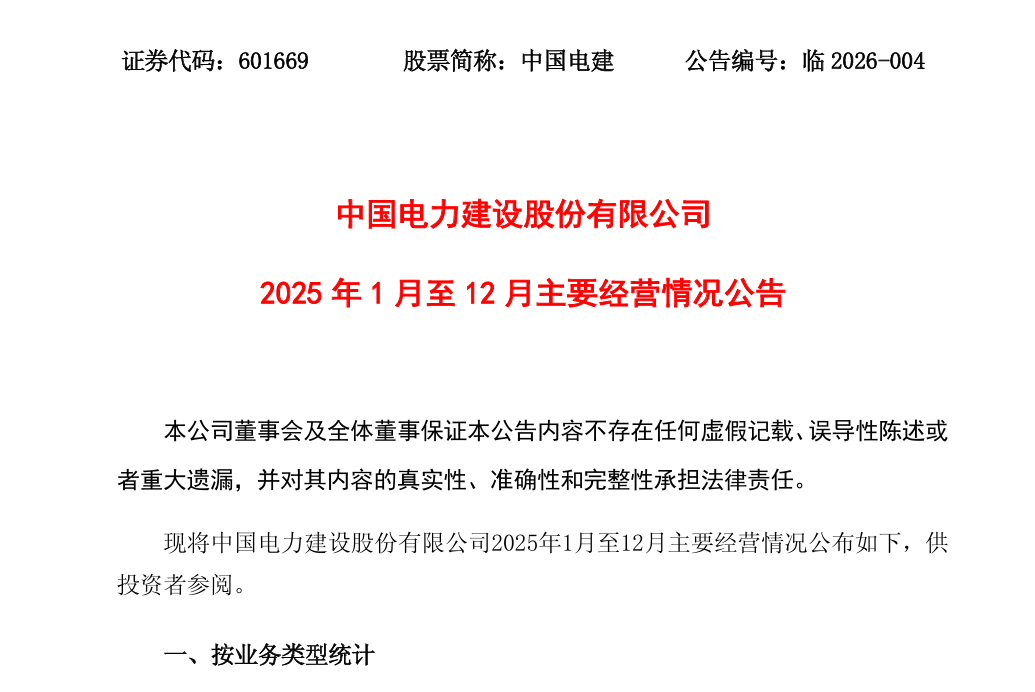 2026年1月24日,中国电力建设股份有限公司(以下简称“中国电建”或“公司”)发布《2025年1月至12月主要经营情况公告》。
