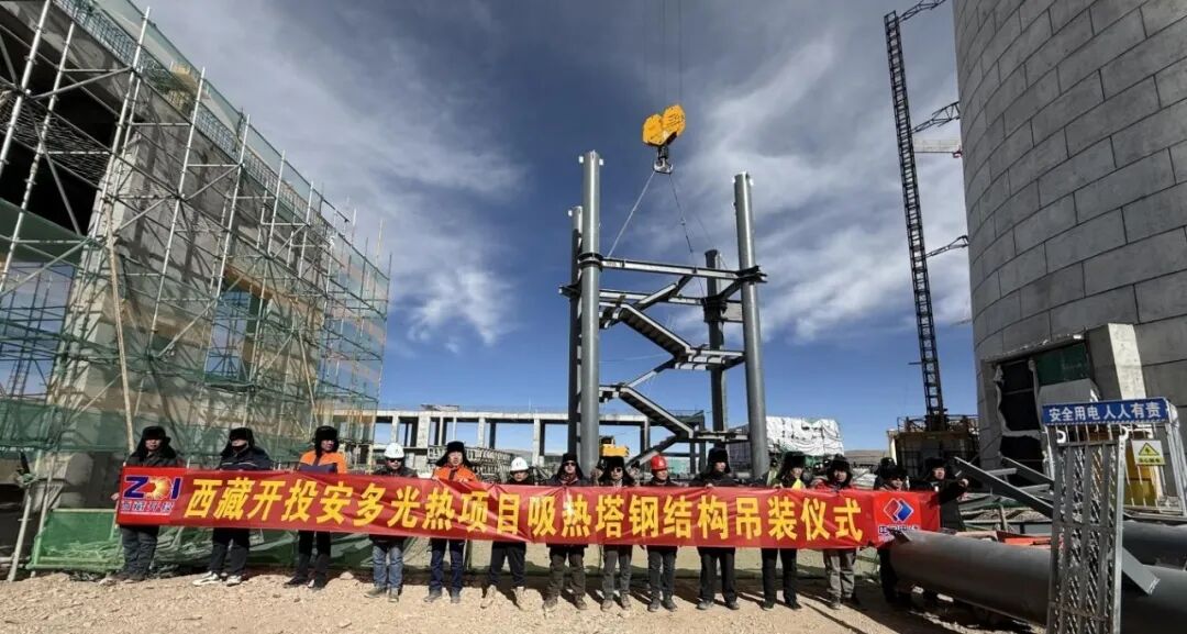 1月14日,西藏开投安多光热项目迎来标志性建设节点——吸热塔钢结构顺利完成首吊作业,标志着吸热塔工程由基础施工阶段成功转入主体结构建设阶段。