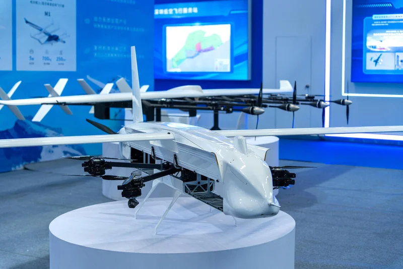 ▲(资料图)2025国际低空经济贸易博览会上的小型垂直起降固定翼无人机产品