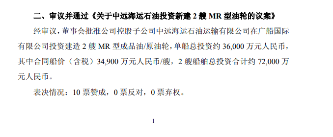 2026年1月26日,中远海运能源运输股份有限公司(中远海能,600026)披露二〇二六年第一次董事会会议决议公告。公告显示,董事会审议并批准公司控股子公司中远海运石油运输有限公司在广船国际有限公司投资建造2艘MR型成品油/原油轮。本次项目单船总投资约3.6亿元人民币,其中合同船价(含税)约3.49亿元/艘,两艘合计总投资约7.2亿元人民币。董事会表决结果为:10票赞成、0票反对、0票弃权。